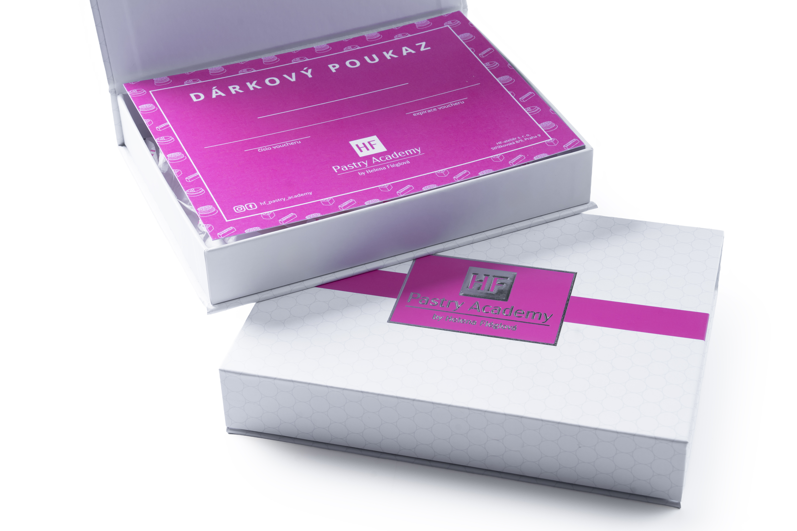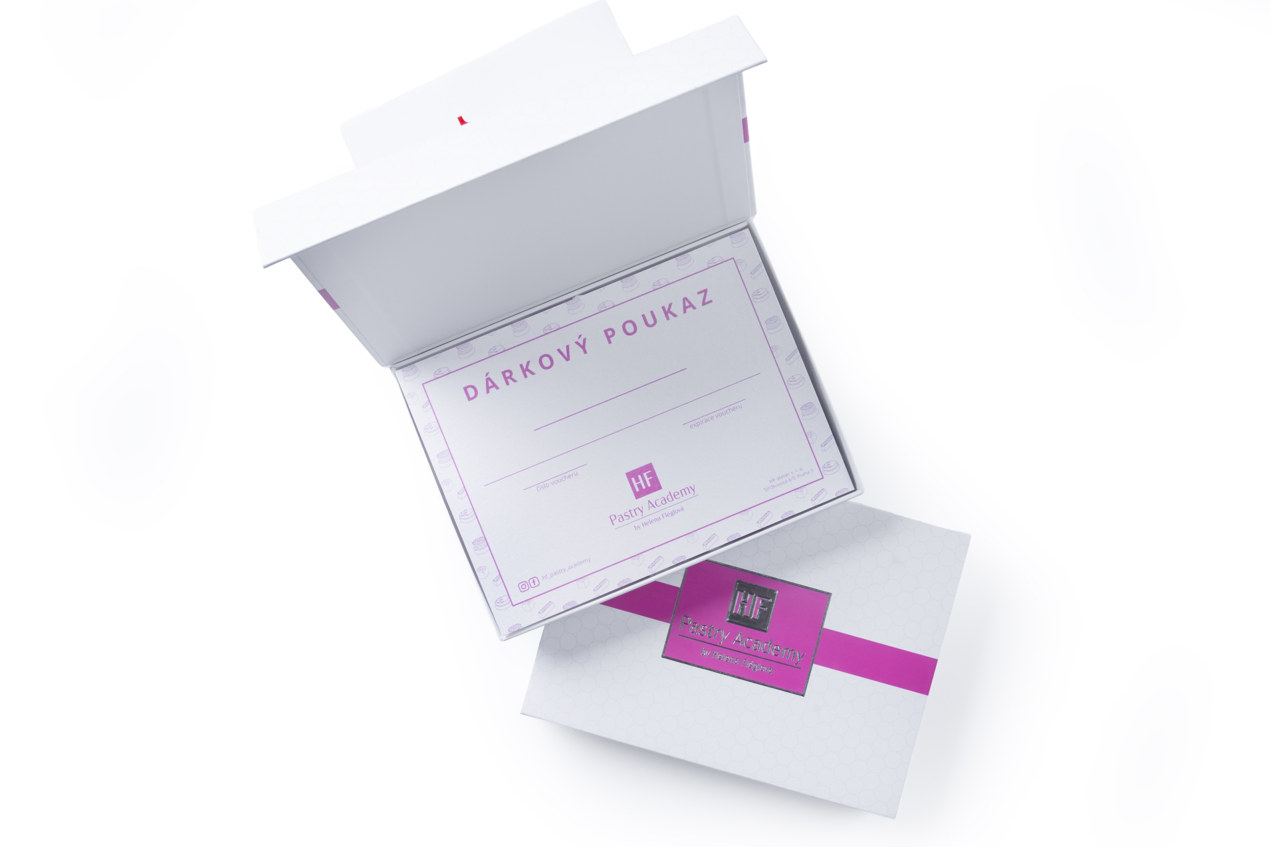Dárkový poukaz, zabalený v krásné dárkové krabičce i s našimi originálními pralinkami. Poukaz lze uplatnit na všechny naše kurzy v HF Pastry Academy, ale také podukty v našem e-shopu.