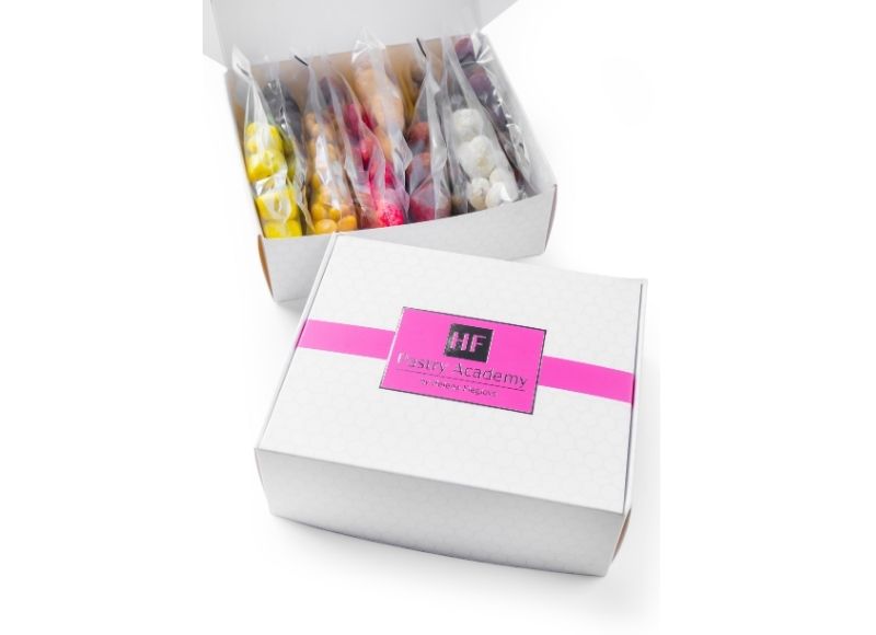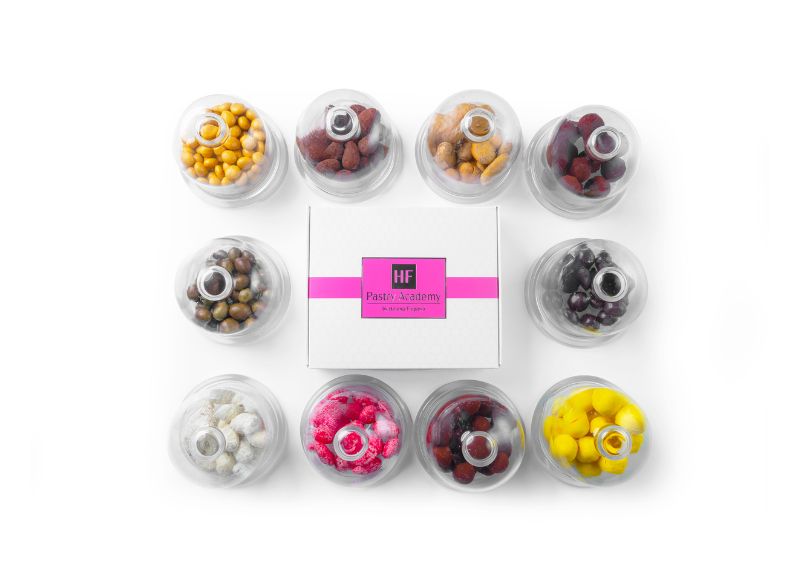 Kniha HF Masterclass I, první profesionální cukrářská kniha v českém jazyce, a k tomu jedinečná Helenina čokoláda Chloé 47,5 %, unikátní mléčná čokoláda s kyselými tóny od Cacao Barry z řady Or Noir.
